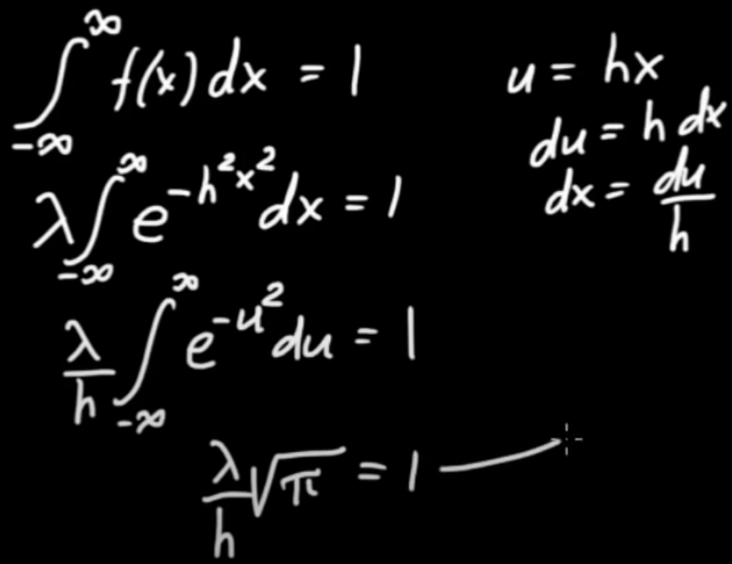 Now we just need to polish up. 1. A can not be positive or it will blow up, so we let A = -h^2, h belonging to Real number; 2. the total area this f(x) covers should be 1 as it is the probability density integral;