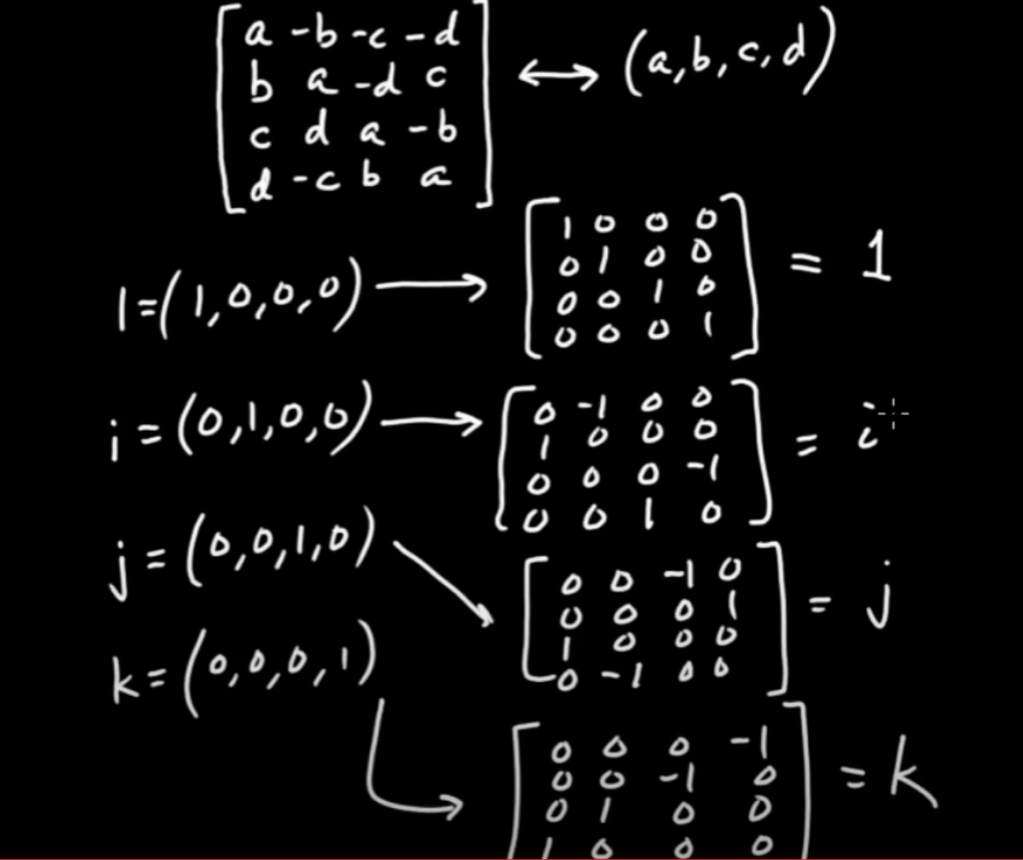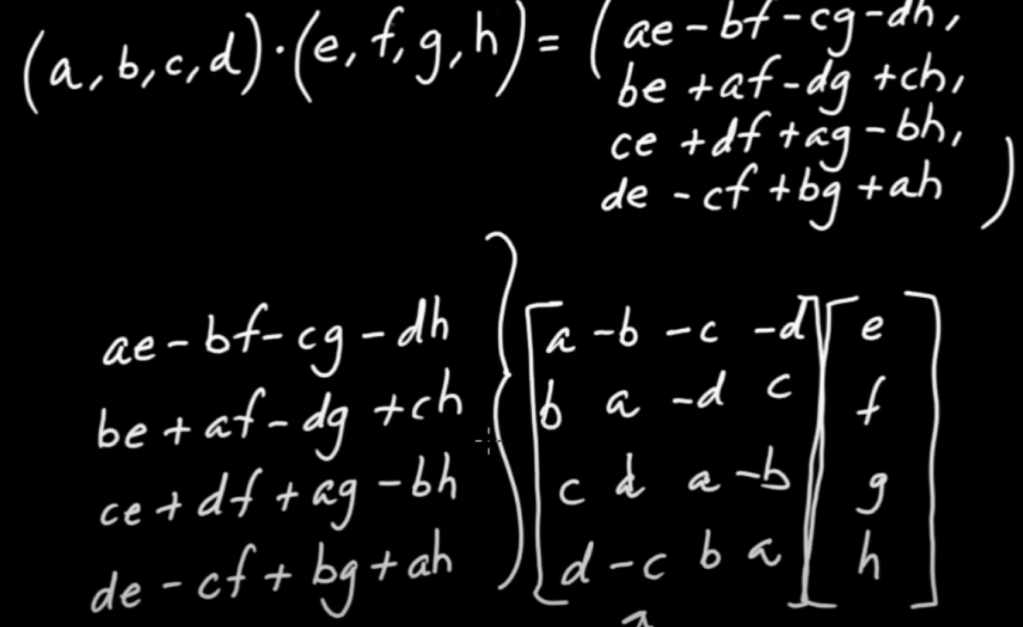 Then we can deduce the multiplication of quaternions. From observation below, mathematicians naturally tends to put this quaternion into matrix (4×4) form as laid out below: