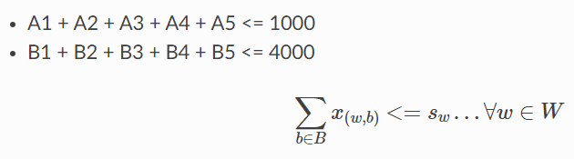 prob += lpSum([vars[w][b] for b in Bars])<=supply[w], "Sum_of_Products_out_of_Warehouse_%s"%w