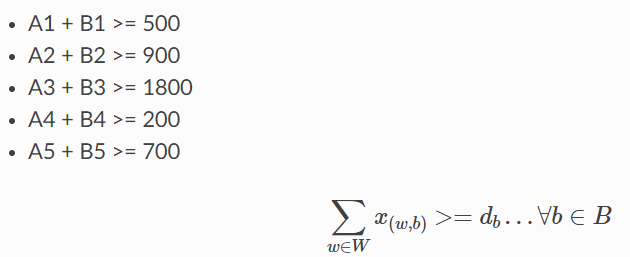prob += lpSum([vars[w][b] for w in Warehouses])>=demand[b], "Sum_of_Products_into_Bar%s"%b