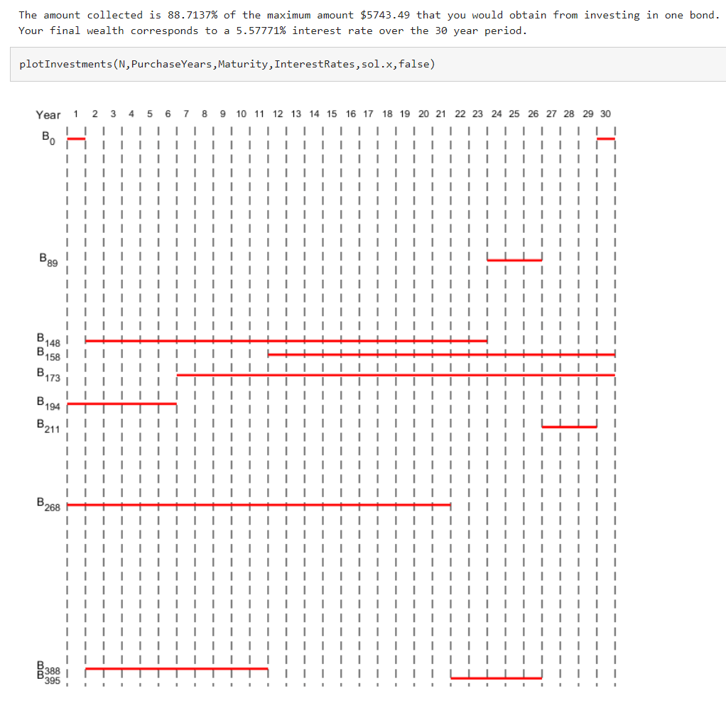 Then solve the problem. The beauty of this set up is that it can be generalized to much complex, bigger case, Create a model for a general version of the problem. Illustrate it using T = 30 years and 400 randomly generated bonds with interest rates from 1 to 6%. This setup results in a linear programming problem with 430 decision variables.