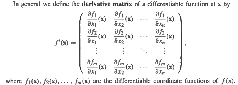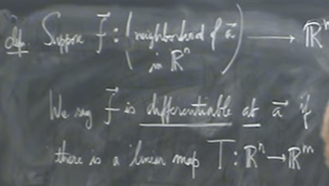 Now using math language to describe the problem: suppose f maps a neighborhood of a in Rm to Rn, we say f is differentiable at a if there is a best linear approximation to f, that is a linear map T, mapping Rn to Rm, so that