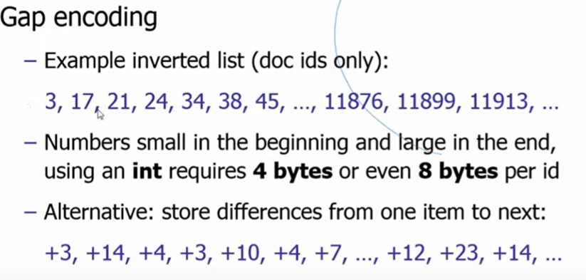 how to compress, there are multiple ways. A simple first way is gap encoding.