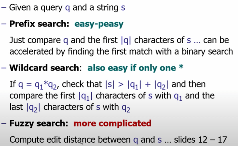 What is fuzzy search, according to wiki, “locates Web pages that are likely to be relevant to a search argument even when the argument does not exactly correspond to the desired information”. Per definition above, we need to compute “edit distance” between q and s for fuzzy search.
