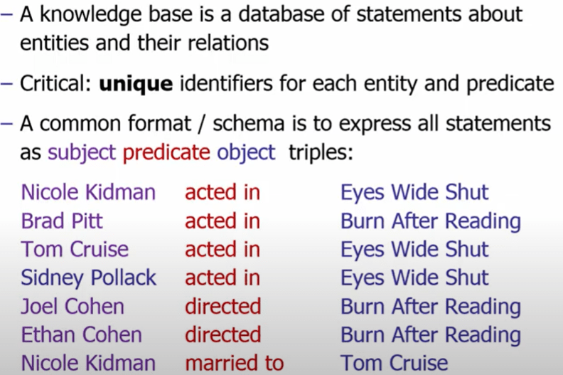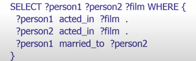 SPARQL is the standard query language for KB, SPARQL Protocol And RDF Query Language. An example is