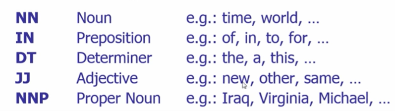 POS(Part of Speech) Tagging: for each word in a sentence, determine whether it’s a noun, a verb, a preposition