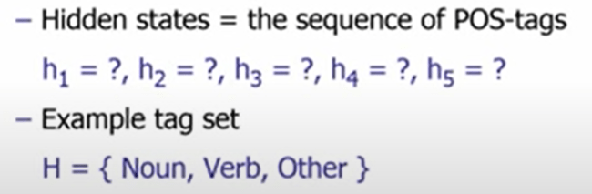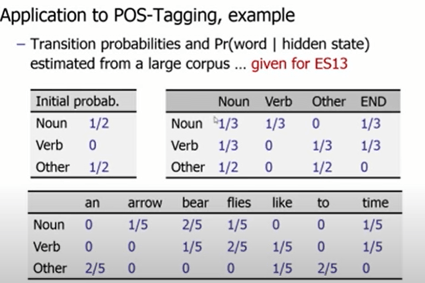The example sentence is “time flies like an arrow”, the observed states is the sequence of words, hidden states are the sequence of POS-tags.