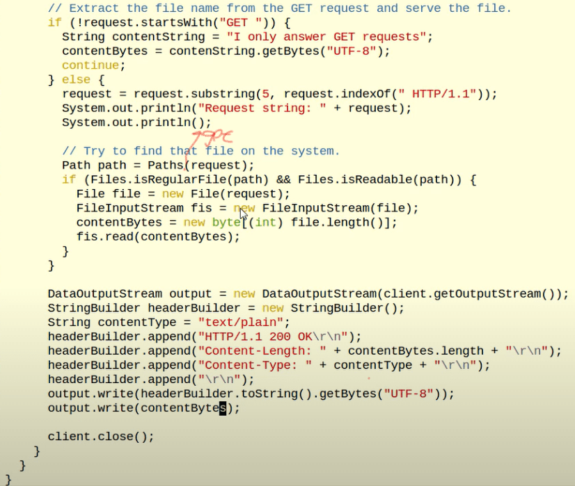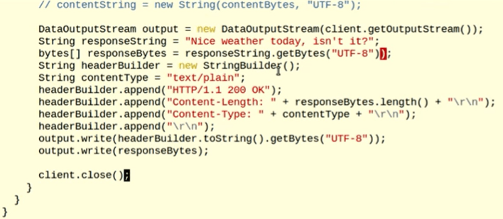 //Server loop.while (true) { Socket client = server.accept(); system.out.println(“client connected from ” + client.getInetAddress());