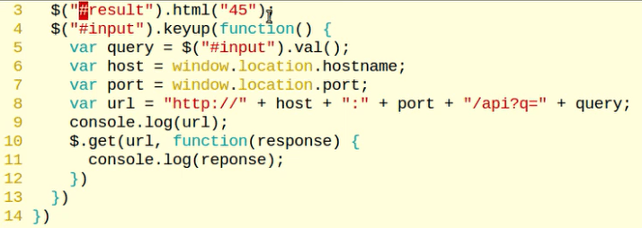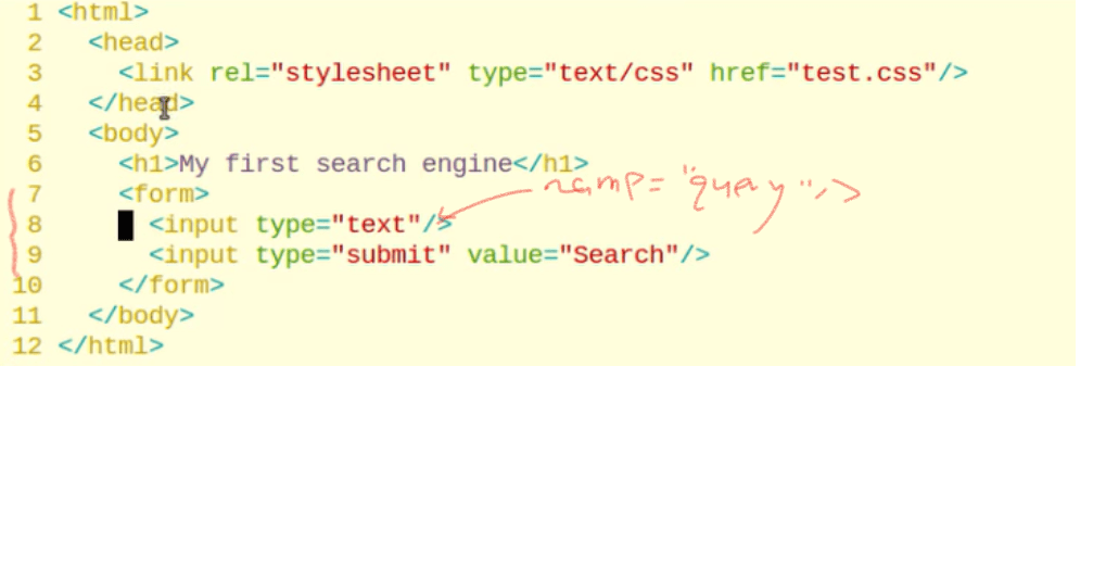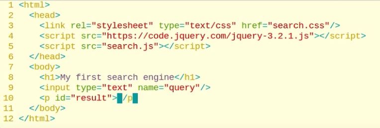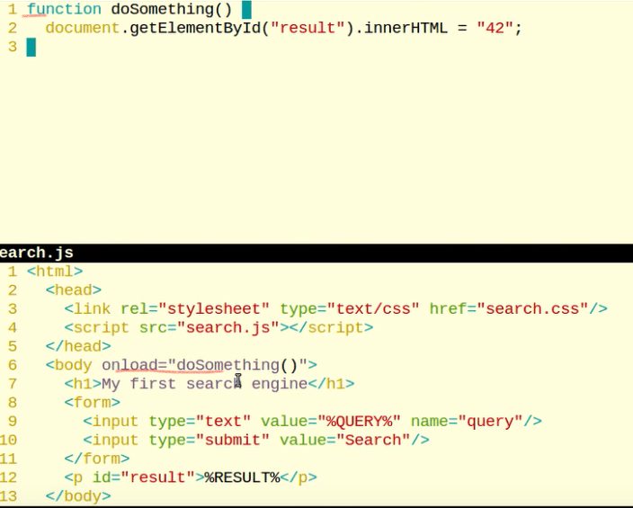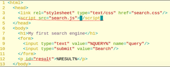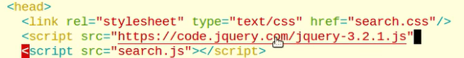 on the html file, two parts (red lines) were edited, we have script source to be search.js, so the java script/server script will also be edited accordingly