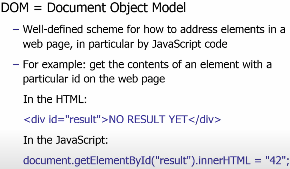 So in JS, there is this notion called DOM, document object model, so below html contains an id=”result”, JS, one writes “document.getElementbyId”result”).innerHTML = “42”;