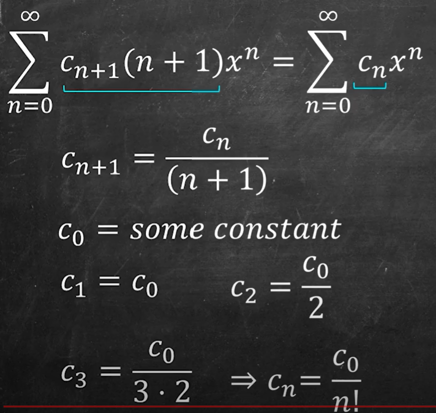 Be mindful the premise is that the series is convergenable, which is tested by Ratio test. Simiraly, solving y’-xy = 0 can apply infinite series, also can apply basis method as below