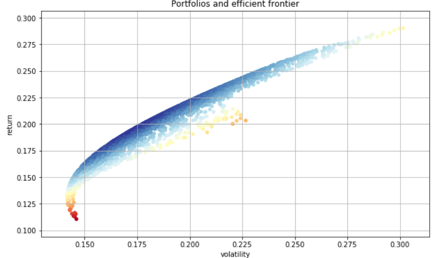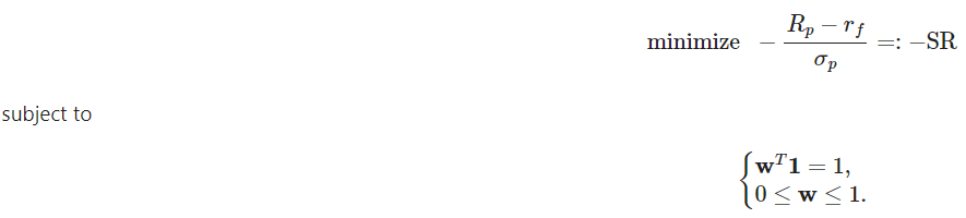 Now, consider the case of finding the portfolio (on the efficient frontier) with the highest sharpe ratio. Note that scipy offers a minimize method, but no a maximize a method, and we may then conclude that we are not able to find such a portfolio by solving an optimization problem. However, the maximization of the sharpe ratio is nothing but the minimization of the negative sharpe ratio. That is, we have