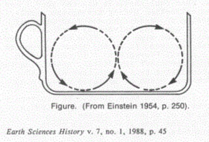 “I begin with a little experiment which anybody can easily repeat. Imagine a flat-bottomed cup full of tea. At the bottom there are some tea leaves, which stay there because they are rather heavier than the liquid they have replaced. If the liquid is made to rotate by a spoon, the leaves will soon collect in the center of the bottom of the cup. The explanation of this phenomenon is as follows: the rotation of the liquid causes a centrifugal force to act on it. This in itself would give rise to no change in the flow of the liquid if the latter rotated like a solid body. But in the neighborhood of the walls of the cup the liquid is restrained by friction, so that the angular velocity with which it rotates is less there than in other places nearer the center. In particular, the angular velocity of rotation, and therefore the centrifugal force, will be smaller near the bottom than higher up. The result of this will be a circular movement (helical flow) of the liquid of the type illustrated in (the figure) which goes on increasing until, under the influence of ground friction, it becomes stationary. The tea leaves are swept into the center by the circular movement and act as proof of its existence.”