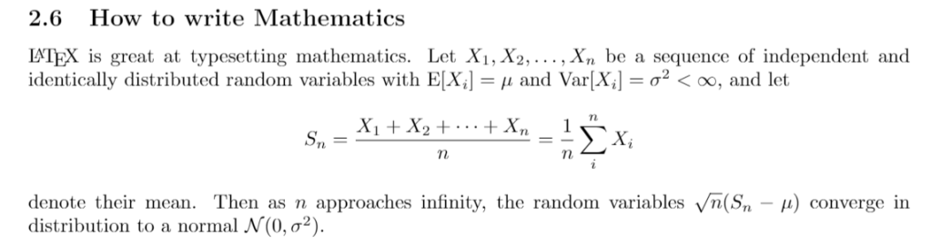 \LaTeX{} is great at typesetting mathematics. Let $X_1, X_2, \ldots, X_n$ be a sequence of independent and identically distributed random variables with $\text{E}[X_i] = \mu$ and $\text{Var}[X_i] = \sigma^2 < \infty$, and let