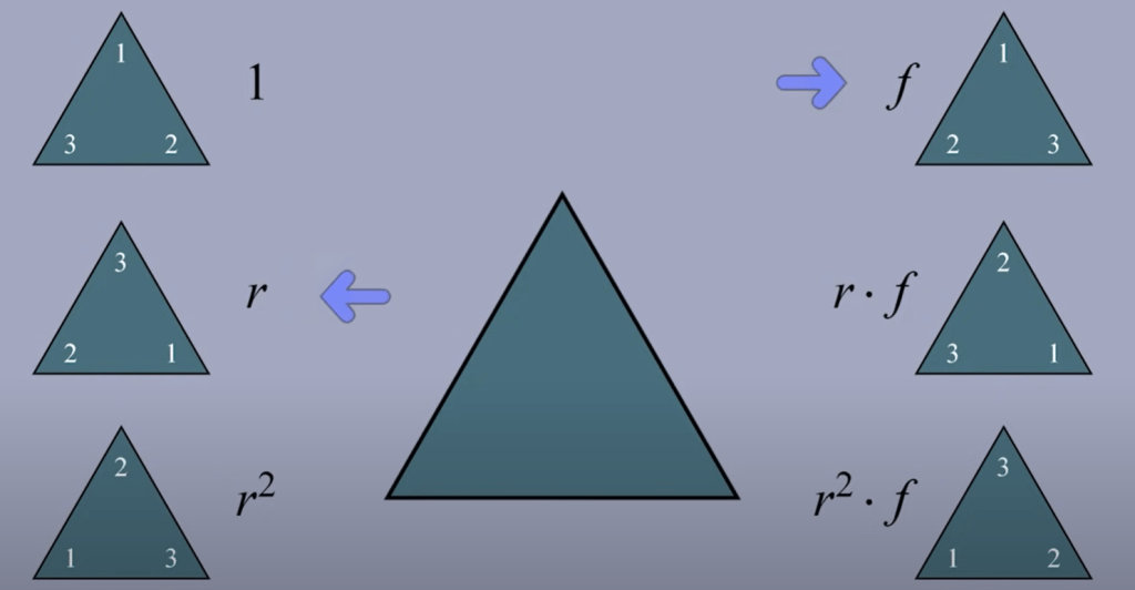 There are only two actions r(rotation) or f(flip) and entirely 6 to move triangle. We call symmetries of triangle.