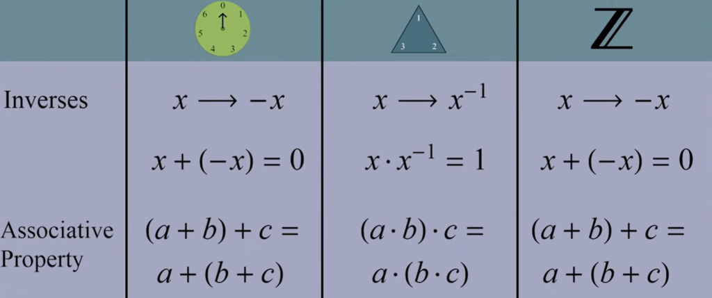 for example the inverse of 3 in clock arithmetic is 4 because 3+4 = 0 the identity, the inverse of r is r squared, the inverse of 3 in integer is -3, -3=0.