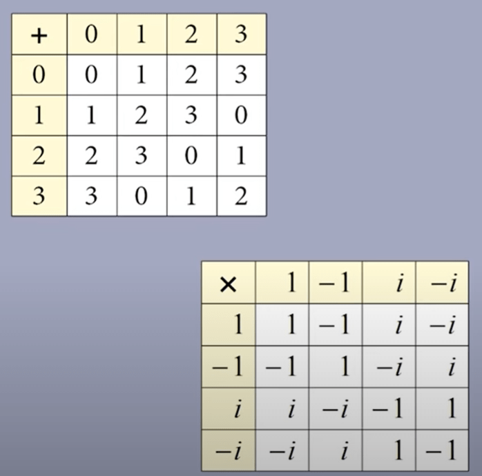 (Z/4Z, +) and group of {1, -1, i, -i} closed under operater x, use Carley table to compare: