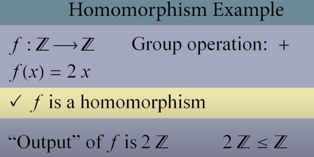 Applying this with an example, integer group to integer group on a function f(x) = 2(x), the two are homomorphic.