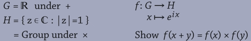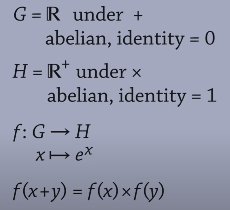 Another example, to judge below two groups under that particular function is homomorphic or not. The answer is yes, because e^(x+y) = e^x + e^y
