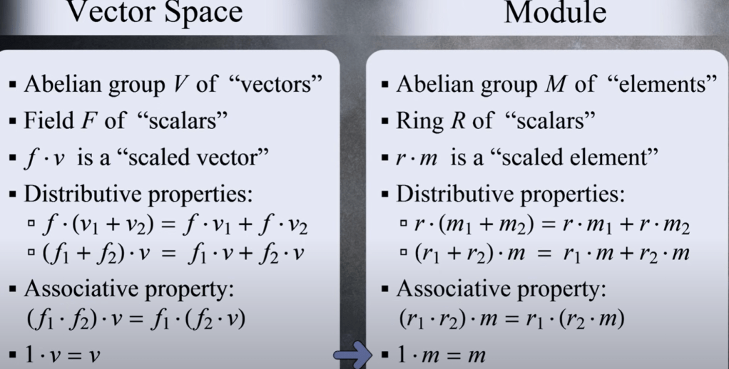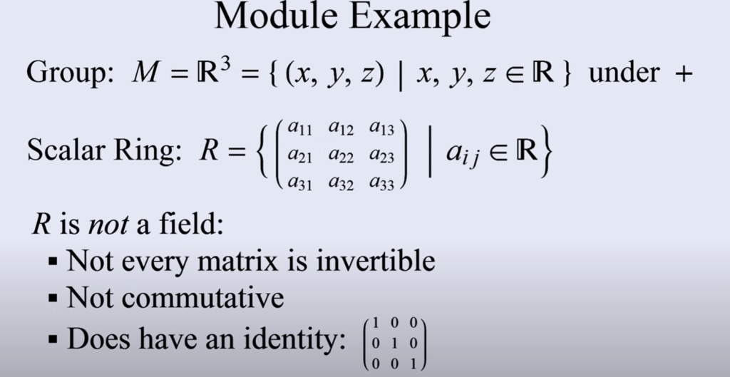 To compare the two, or deeply understand module, let’s take a concrete example, note below the scalar ring is a matrix.