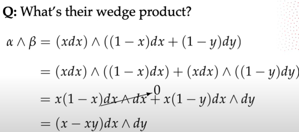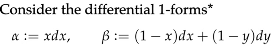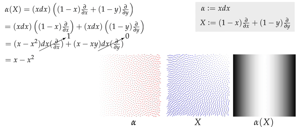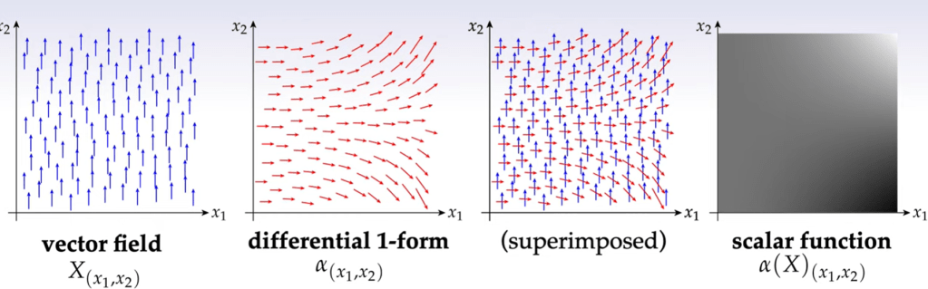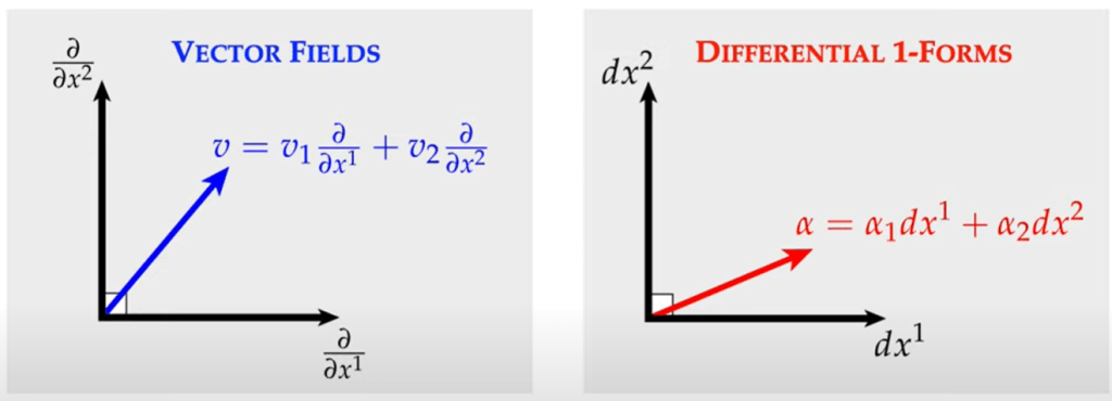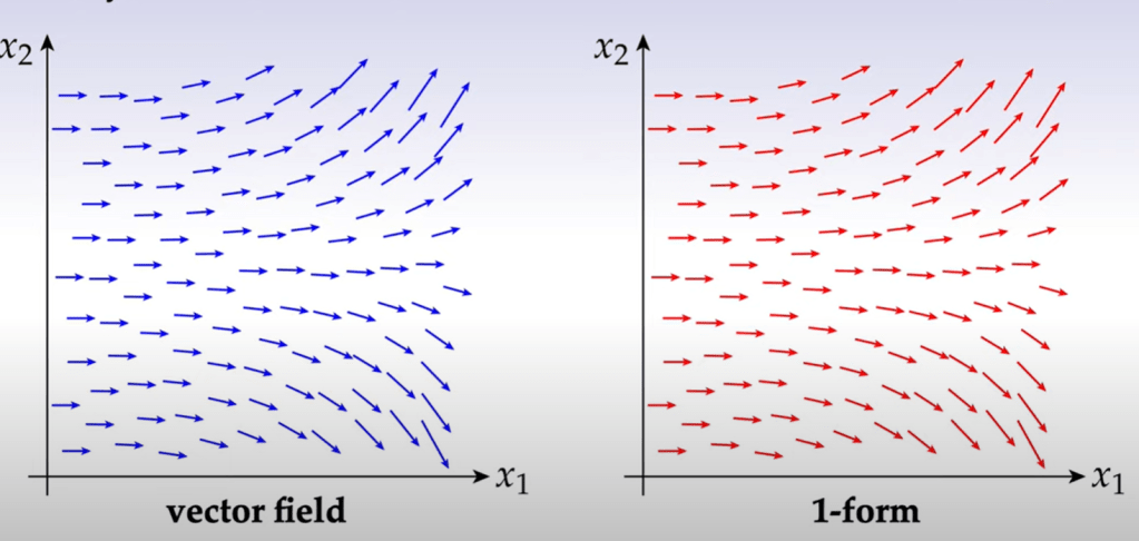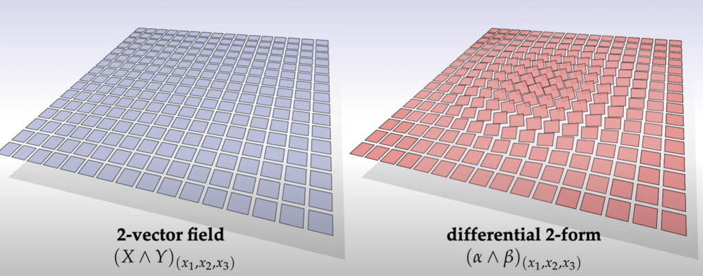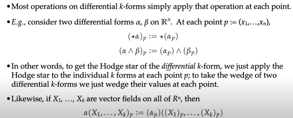 What’s Differential Forms, it’s spatially varying k-form. It’s used to measure k-vectors. Superficially k-vector space looks similar/same as differential k-1 form: