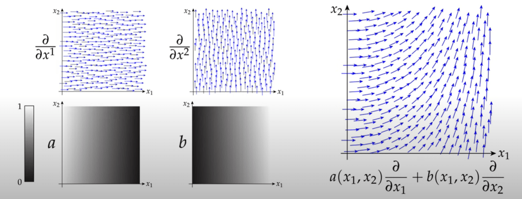 Now put it to the frame of coordinates. so we can compute. First, on the base of basis vector, we can learn basis vector field, further extending, the coefficient doesnt’ have to be a constant scalar but a function of scalar, so below graph illustrate: