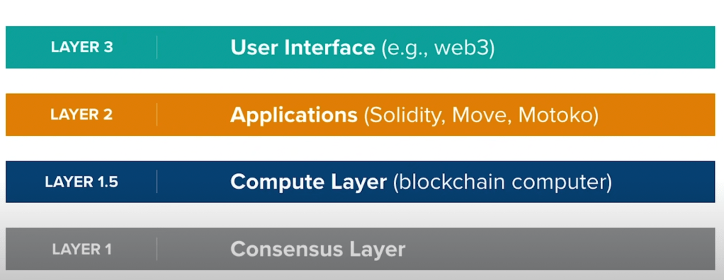 Blockchain is huge development on cryptography, depicted in 4 layers as follows: consensus, compute, application(solidity, move motoko language programing) and top layer is the user interface web 3.0.