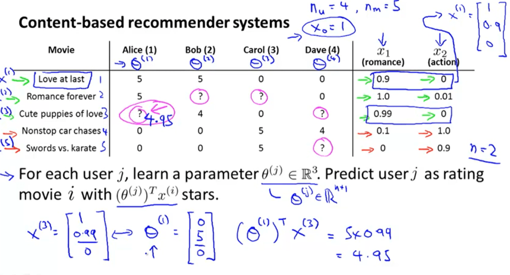 The clever part is to introduce the x1, x3 features – content based features – and apply each one with specific theta parameters.