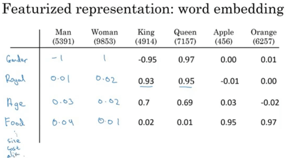 Every word is represented by on-hot representation, but the key is embedding, which is to featurize them.