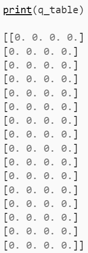 First, to create the Q-table, number of rows is the size of the state space in the environment, in this case it’s 16 state space; the number of columns is equivalent to the size of the action space, in this case, only 4 moves/actions, up down left right.