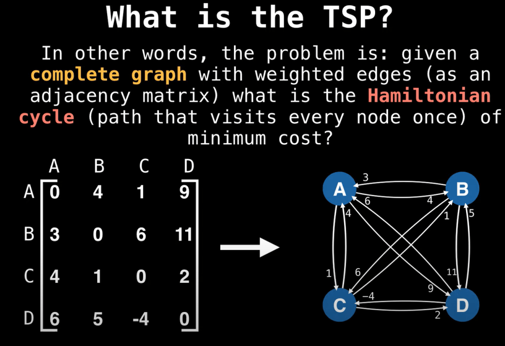 The brute force way to solve TSP is to compute the cost of every possible tour. O(n!) time complexity.