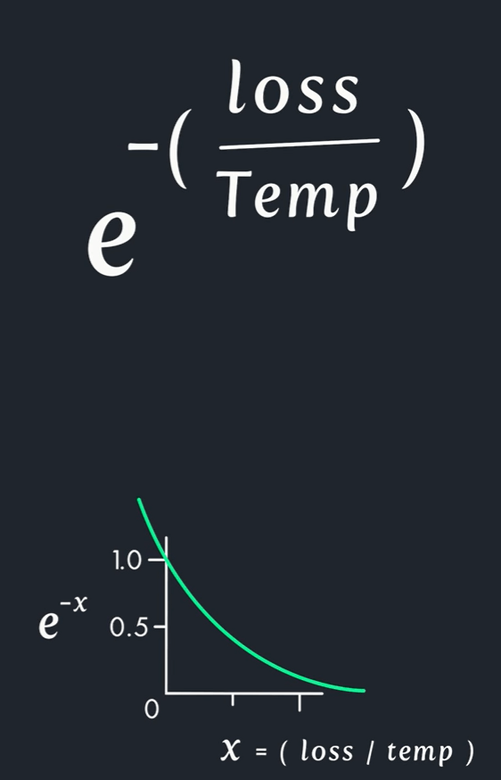 Whether to continue exploring, SA needs to compute a probability score, from equation below, one can see a higher temperature or smaller loss will cause higher probability.