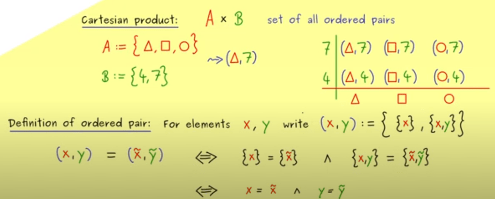 With the sets theory from previous, we can define ordered pairs/Cartesian product: