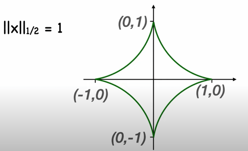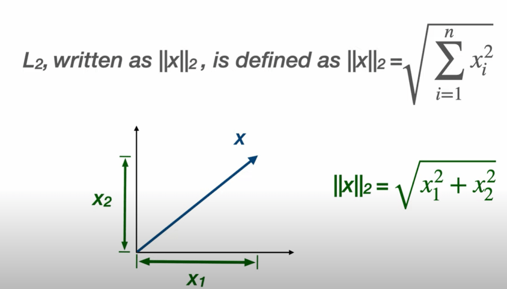So there is the concepts of L1 norm and L2 norm. L2 norm is more familiar as below, while L1 is simple addition ||X||1 = |X1| + |X2|.