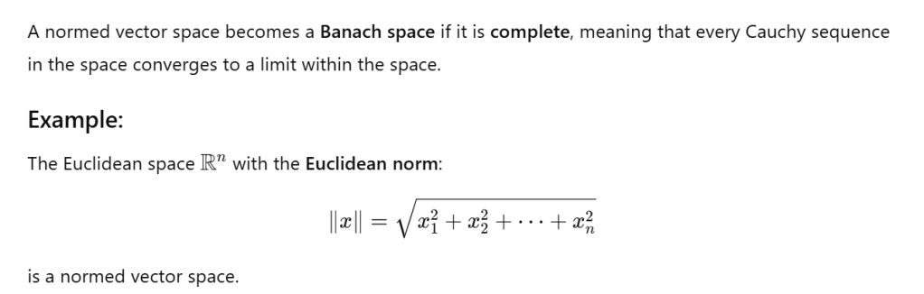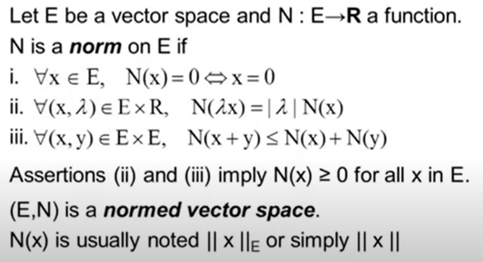Along the same pattern as the function of distance and then notion of metric space, so is the function of “norm” and then the notion of “normed vector space”.