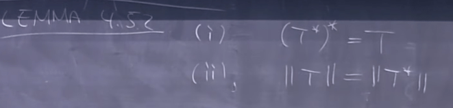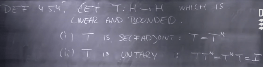 04:30 – Normed Vector Spaces; 08:30 – The Adjoint Operator; 18:30 – Theorem 4.5.1; 19:30 – Proof; 24:00 – Lema 4.4.2; 32:30 – Example Week 2; 12:45 – Definition Inverse Of T; 13:45 – Exercise 4.19; 20:15 – Basis; 20:45 – Recall; Topological, Metric Space, Normed Vector Space, Banach Space and Hilbert Space.