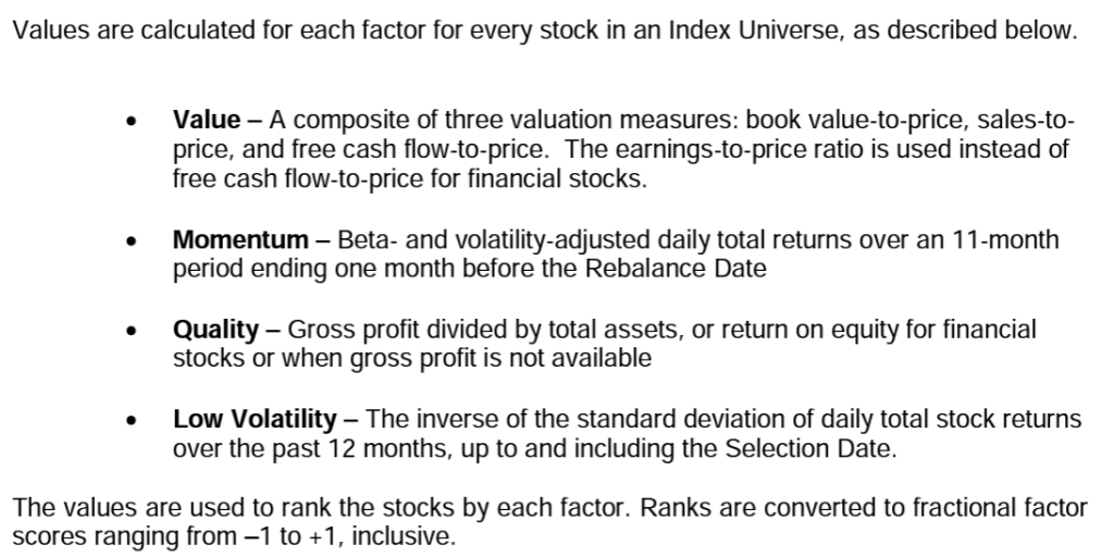 Once the factor scores are rescaled, stocks with factor scores greater than 0 are overweighted relative to the Index Universe. Stocks with factor scores less than or equal to 0 are underweighted relative to the Index Universe.