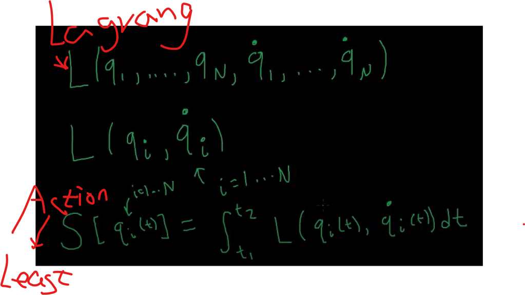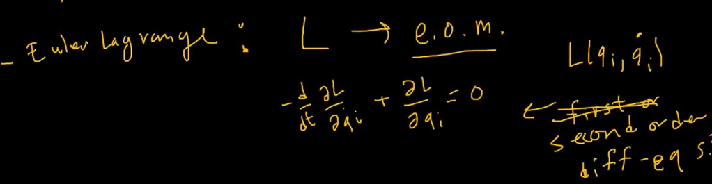 Euler Lagrange Equation is to describe the e.o.m, equation of motion, it’s always composed of two parts: qi and qi first order derivative, L = Kinetic Energy – Potential Energy, hence after meticulous and rigorous mathematical deduction with Taylor expansion involved, the final second order differentiation is to be solved as shown below.
