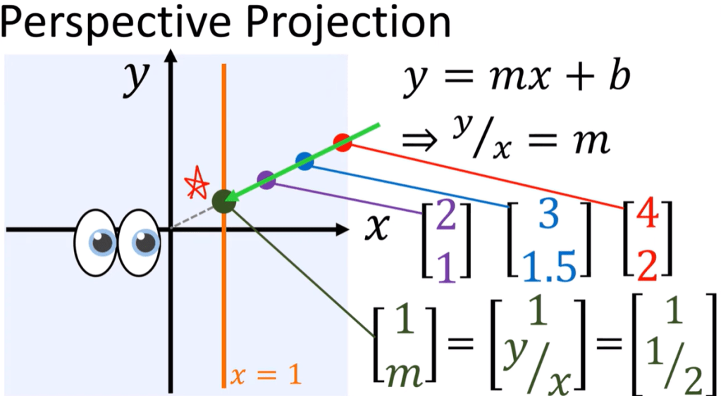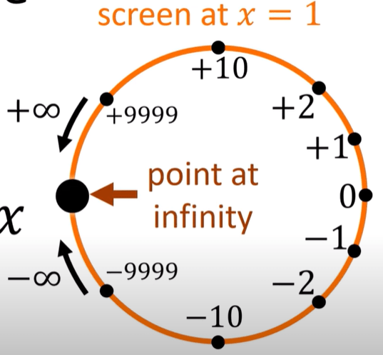 The line gets projected to is called real projective line CP1. Note the dots on the vertical line, i.e. the x component is 0, then the m value is infinite, we call those point on the vertical line – point at infinity.