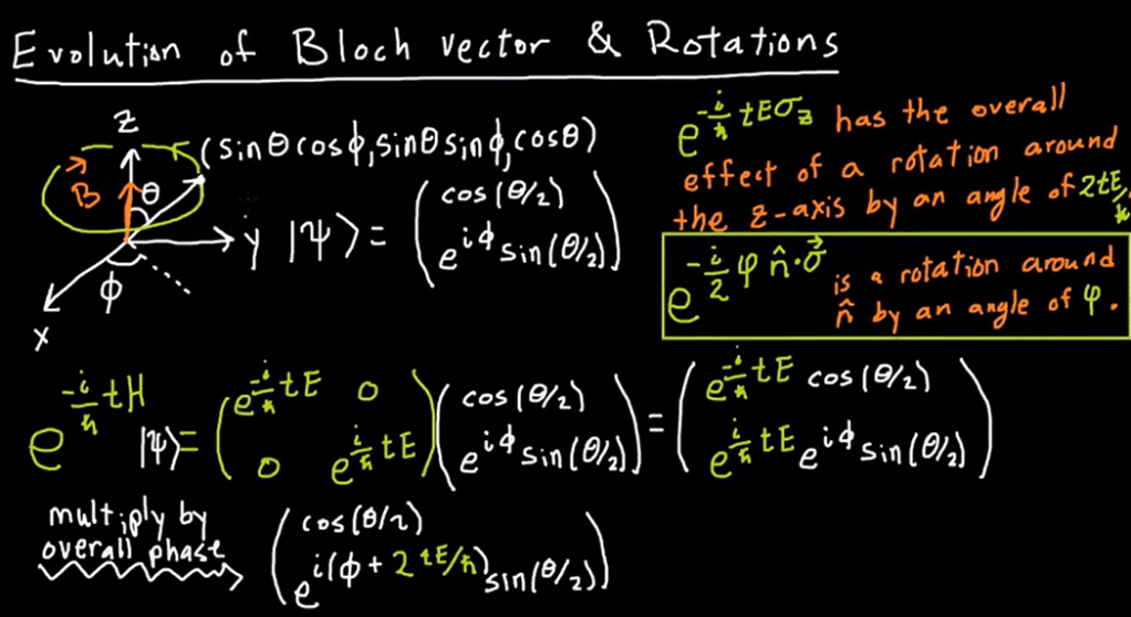 Evolution of Bloch vectors and rotations: if there is an arbitrary unit vector n, and set the magnetic field B same along z axis: time evolution in a magnetic field is a ROTATION.
