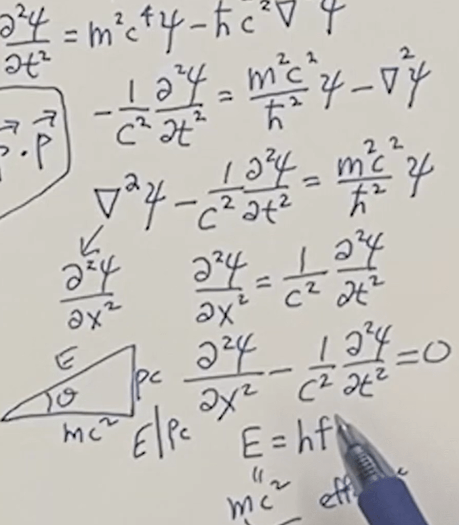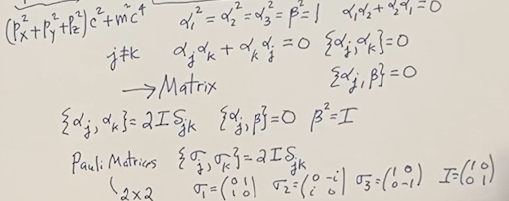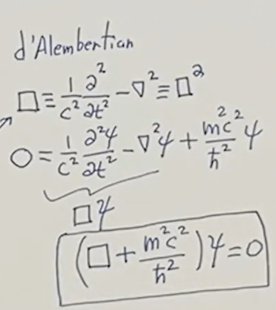 He reviewed Pauli Equation and Shrodinger Equation, which is not relativistic. Let’s derive Klein-Gorden Equation in relativistic framework, from E^2 = m^2 c^4 + p^2 c^2