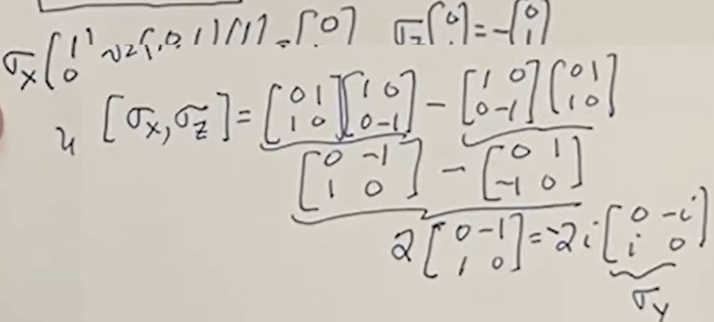 Note use sigma x to measure the state [1, 0], we can’t get [1, 0] back, instead, as detailed in previous blog, we know the eigen vector is 1/sqr2[1, -1] and 1/sqr2[1, 1], sigma x and sigma z are not simultaneous eigenvectors.