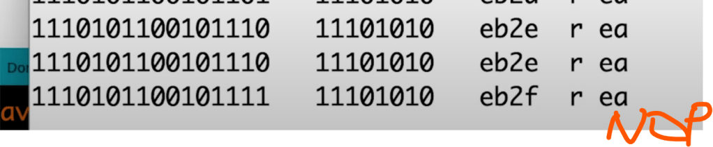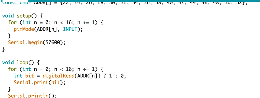 Then hook up Arduino to view what’s going on inside the chip. What to do is to connect the 16 address line A1-A15 to the i/o lines in Arduino. below is the codes you write on Arduino, to print out to view.
