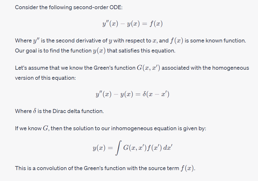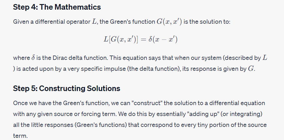 According to ChatGPT, Green’s function can be thought of as the “response” of a system to a very specific “poke” or “impulse” at a particular point.