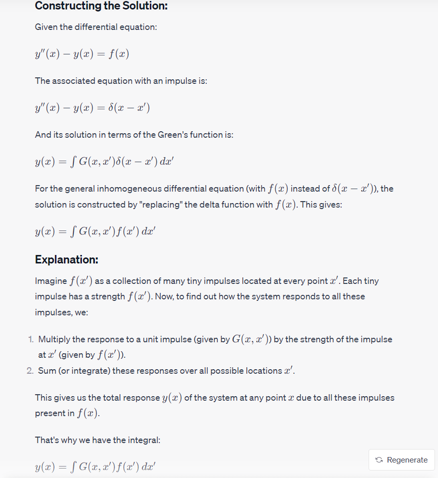 By solving the equation with this impulse, the Green’s function tells us how the system responds to such a “kick” at any given point x′. Once we know that, as mentioned, we can predict the system’s response to more general disturbances or inputs.