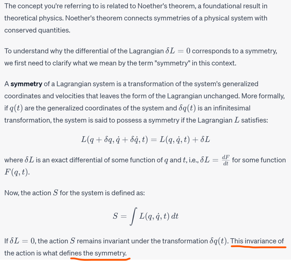 Noether’s theorem reveals symmetry and conservation. There are spatial translation symmetry, time translation symmetry, rotation symmetry, leading to momentum, energy and angular momentum conservation.