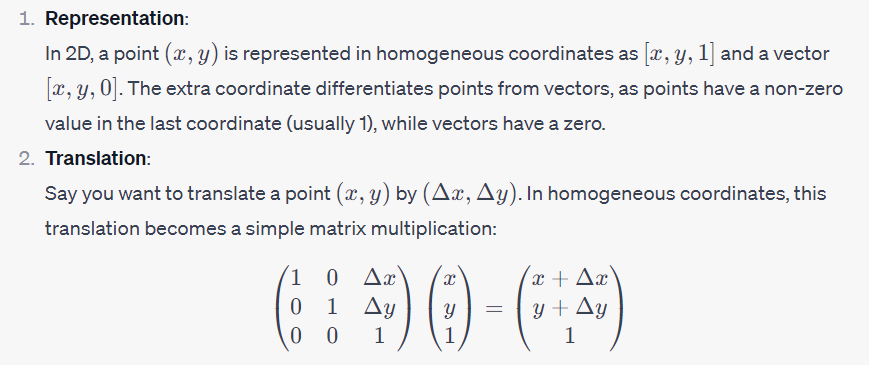 I am particularly interested in “how are homogeneous coordinates allow for a unified representation of points and vectors, and make transformations such as translation, rotation, scaling, and projection straightforward to compute using matrix multiplication”