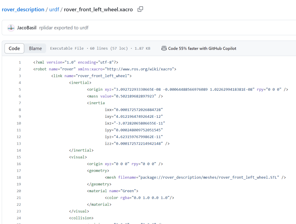 - However, URDF can get quite verbose when describing complex robots, and it does not support variables or macros, which can lead to a lot of repetition in the XML code.