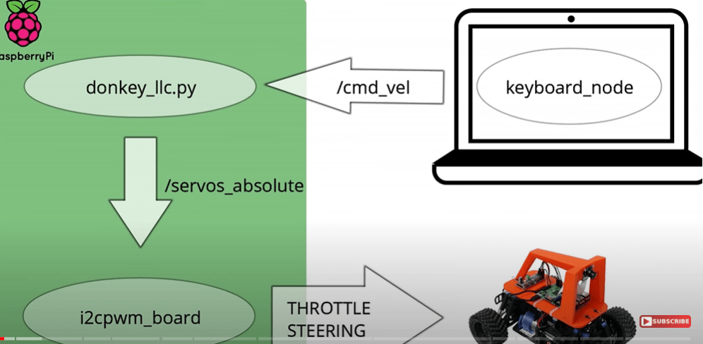 then knowing the concept of nodes, topic, subscriber publisher: in below screenshot, the donkey_llc.py and i2cpwm_board are two nodes, while /servos_absolute and /cmd_vel are topics.