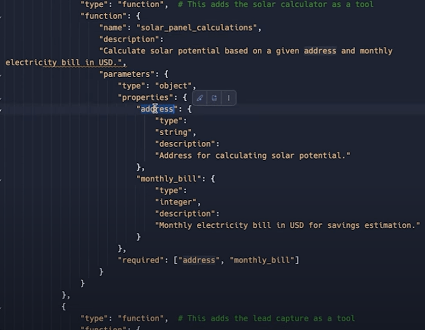 how to define json funciton calling a third-party API? here is a good example by Liam Ottley. First solar panel cost calculation function is partialy shown here, you don’t need to write on your self, chatGPT should be able to guide you: